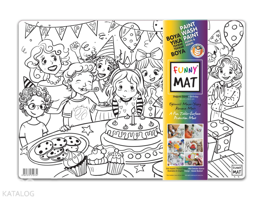 Funny Mat, 33,5x48 cm ölçüsünde her türlü etkinlik sırasında masa ve yüzey koruyucu olarak kullanılabilen bir üründür. Üzerinde yemek yenebilir, kil ve oyun hamuru ile oyun oynanabilir, ders çalışılabilir, boyama yapılabilir… Kendisi de bir etkinlik materyali olan Funny Mat'ın üzerindeki desenler hem keçeli kalemlerle hem de kuru boyalarla istenildiği gibi renklendirilebilir ve çocuklar bu sayede yaratıcılıklarını geliştirebilirler. Suyun altına tutulduğunda veya ıslak mendille silindiğinde kolaylıkla temizlenen Funny Mat, defalarca renklendirme ve aynı ürünü farklı amaçlarla kullanma imkânı vererek bütçe dostu bir ürün olma özelliği de taşımaktadır.