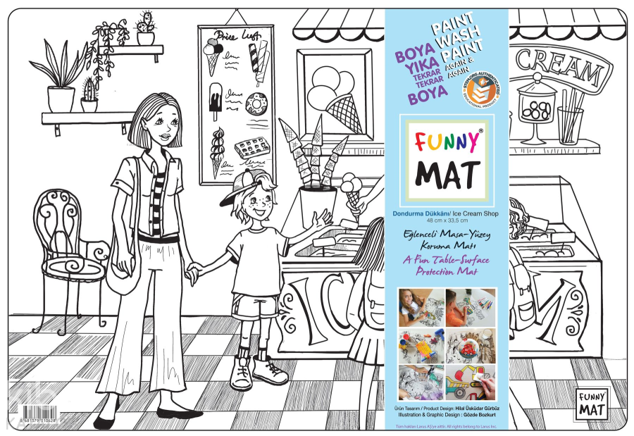 Funny Mat, 33,5x48 cm ölçüsünde her türlü etkinlik sırasında masa ve yüzey koruyucu olarak kullanılabilen bir üründür. Üzerinde yemek yenebilir, kil ve oyun hamuru ile oyun oynanabilir, ders çalışılabilir, boyama yapılabilir… Kendisi de bir etkinlik materyali olan Funny Mat'ın üzerindeki desenler hem keçeli kalemlerle hem de kuru boyalarla istenildiği gibi renklendirilebilir ve çocuklar bu sayede yaratıcılıklarını geliştirebilirler. Suyun altına tutulduğunda veya ıslak mendille silindiğinde kolaylıkla temizlenen Funny Mat, defalarca renklendirme ve aynı ürünü farklı amaçlarla kullanma imkânı vererek bütçe dostu bir ürün olma özelliği de taşımaktadır.