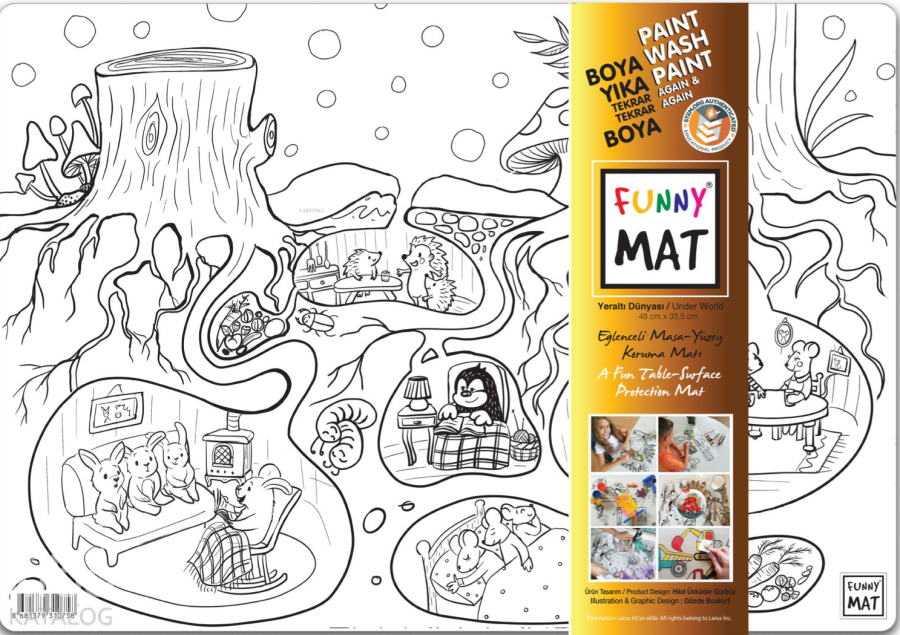 Funny Mat, 33,5x48 cm ölçüsünde her türlü etkinlik sırasında masa ve yüzey koruyucu olarak kullanılabilen bir üründür. Üzerinde yemek yenebilir, kil ve oyun hamuru ile oyun oynanabilir, ders çalışılabilir, boyama yapılabilir… Kendisi de bir etkinlik materyali olan Funny Mat'ın üzerindeki desenler hem keçeli kalemlerle hem de kuru boyalarla istenildiği gibi renklendirilebilir ve çocuklar bu sayede yaratıcılıklarını geliştirebilirler. Suyun altına tutulduğunda veya ıslak mendille silindiğinde kolaylıkla temizlenen Funny Mat, defalarca renklendirme ve aynı ürünü farklı amaçlarla kullanma imkânı vererek bütçe dostu bir ürün olma özelliği de taşımaktadır.