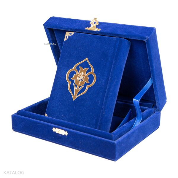 Kadife Kutulu Kur'an-ı Kerim (Büyük Cep Boy, Güllü, Koyu Mavi)
