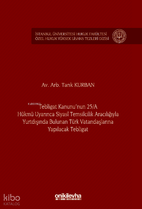 İşbu eser, yurtdışında bulunan Türk vatandaşlarına yapılacak tebligatı düzenleyen 7201 Sayılı Tebligat Kanunu'nun 25/A maddesi ve bu maddeye ilişkin ikincil mevzuat hükümlerini incelemektedir.Eserde, konunun daha iyi anlaşılması adına öncelikli olarak, tebligata ilişkin temel ilkeler, yurtiçi ve yurtdışında gerçekleştirilecek tebligata ilişkin başlıca usuller incelenmiştir. Daha sonra Tebligat Kanunu'nun 25/A hükmü uyarınca yapılacak tebligatın uygulama alanı, şartları, usulü, yapılacak işlemler, bu konuda yaşanan sorunlar farklı ihtimaller kapsamında, doktrin ve uygulamadan örneklerle ayrıntısı ile irdelenmiş ve bu konuda yaşanan sorunlara ilişkin çözüm önerileri ortaya konulmuştur. Çalışmada ayrıca, Tebligat Kanunu'nun 25/A hükmü ile düzenlenen tebligat usulünün milletlerarası hukuk bağlamındaki dayanağı, bu alanda oluşturduğu problemler, bu problemlerin tebligatın geçerliliğine etkisi irdelenmiş ve bu problemlerin çözümüne ilişkin öneriler gerekçeleriyle birlikte sunulmuştur.