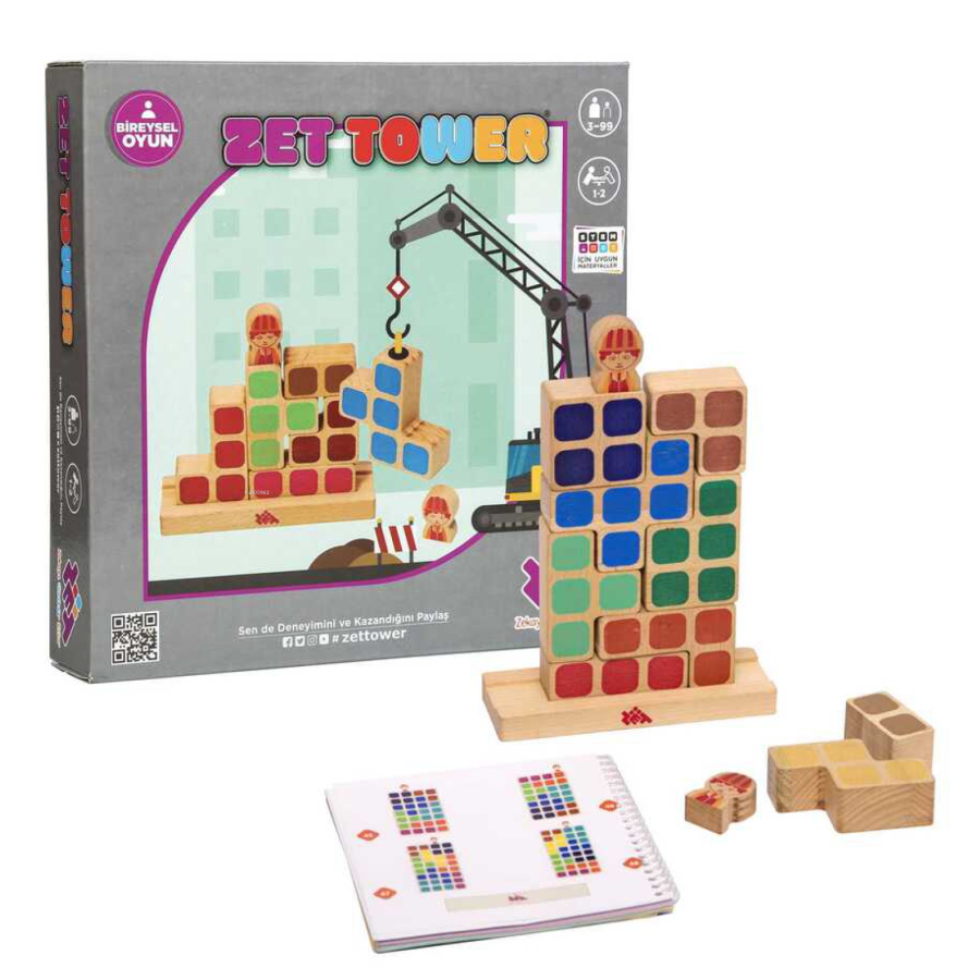 Yaş Aralığı: 3-99 Oyuncu Sayısı: 1 Gelişim Alanları: Görsel Algı Dikkat ve Konsantrasyon Bağlamsal Düşünme Mantık Yürütme Otokontrol Sosyal-Duygusal Gelişim Oyun İçeriği: 1 adet ahşap oyun platformu 9 adet ahşap geometrik blok 2 adet ahşap mühendis 1 adet oyun görev kitapçığı Oyuna Hazırlık: Oyun platformunu, ahşap blokları ve mühendisleri düz bir alana yerleştirin. Görev kitapçığındaki ilk görevden başlayarak oyunu devam ettirin. Nasıl Oynanır? Her biri farklı şekil ve renkte olan ahşap bloklarla inşa faaliyeti yapmanız gerekiyor. Görev kitapçığındaki görevlerde size verilen zeminde deseni oluşturun ve tamamlamanız için verilen ilave ahşap blokları alıp, sınırları çizgi ile gösterilmiş alanı oluşturmaya çalışın. Görevde verilen mühendisi, dizili blokların üzerinden tamamen inmemelidir. Bunun yerine inşa devam ederken katlar arasında basamaklar ile inip çıkabilir. Mühendis, bloklardaki bir katmanı tek seferde inebilir, iki veya daha fazla katmanı aynı anda inemez. Bu kurallarla size verilen blokları, verilen alana mühendisi kadem kademe yukarı taşıyarak tamamlamaya çalışın. Dikkat: - Görev kitapçığındaki her görevde sizden belli alanı belirli bloklarla doldurmanız istenir. - Blokları alana doldururken mühendis inşa alanından tamamen zemine inemez. - Mühendis, bloklar arası geçişte adım adım ilerler ve inip çıkar. Her adımda tek katmanı kullanabilir. Eğer önünde birden fazla katman var ise o alanda inemez/çıkamaz. - Görevinizin doğruluğunu cevap anahtarına bakarak teyit edebilirsiniz ancak her görevde birden fazla doğru çözüm olabilmektedir. Sizin çözümünüzün doğru olduğunu kurallar çerçevesinde oyuna tamamlayıp tamamlamadığınızdan yola çıkarak teyit edebilirsiniz.
